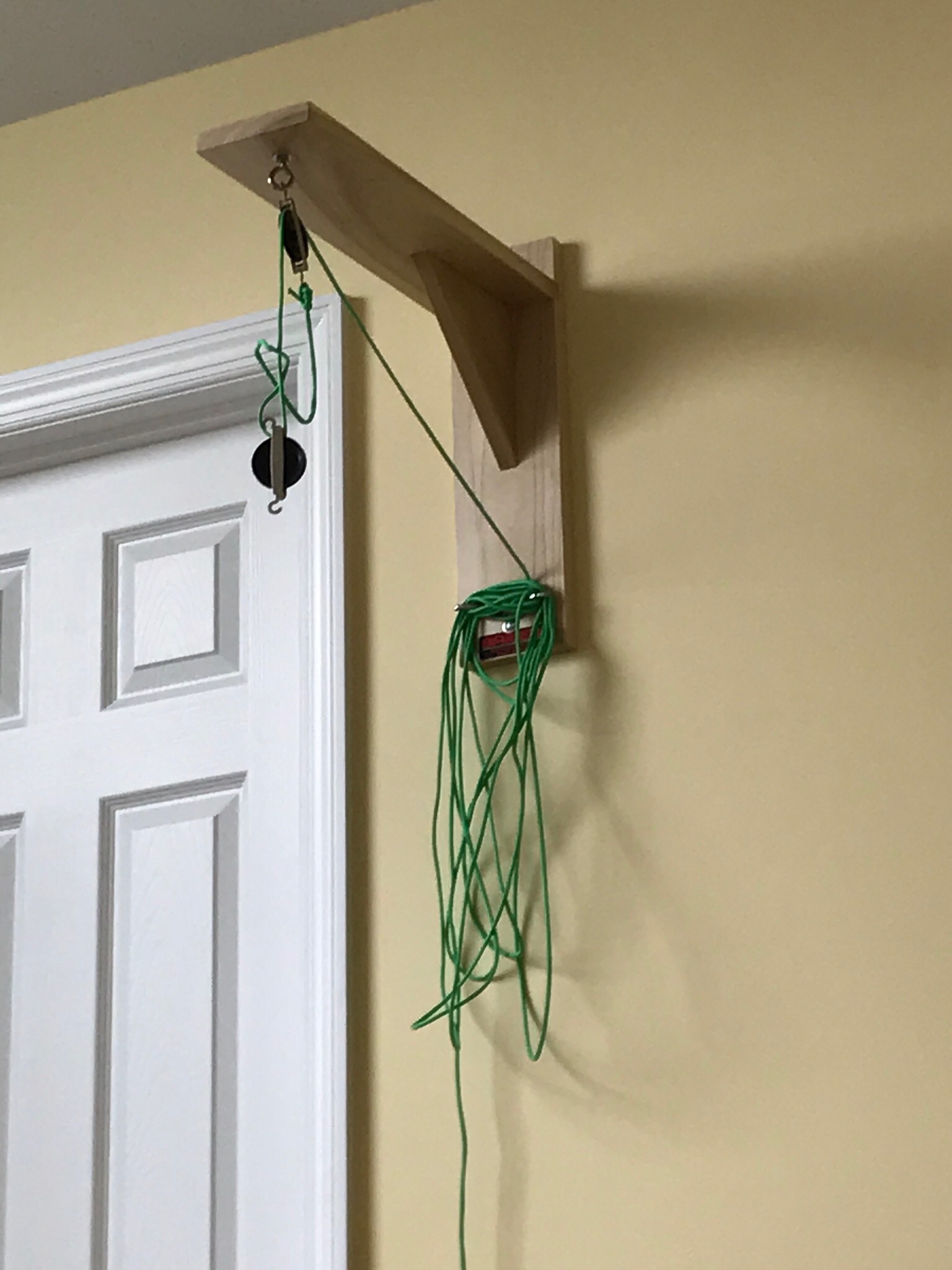 My wife asked me to create an easier method of carrying laundry downstairs. I designed and built a hoist as a solution. The bracket was available from Amazon, as well as the pulleys. Cord, an eyebolt, a cleat and toggle bolts were bought at a hardware store. The bracket was secured to the wall with the toggle bolts (rated at 80 lbs. each). I rigged a simple block and tackle to lower and raise a laundry basket. The pictured prototype is the result.