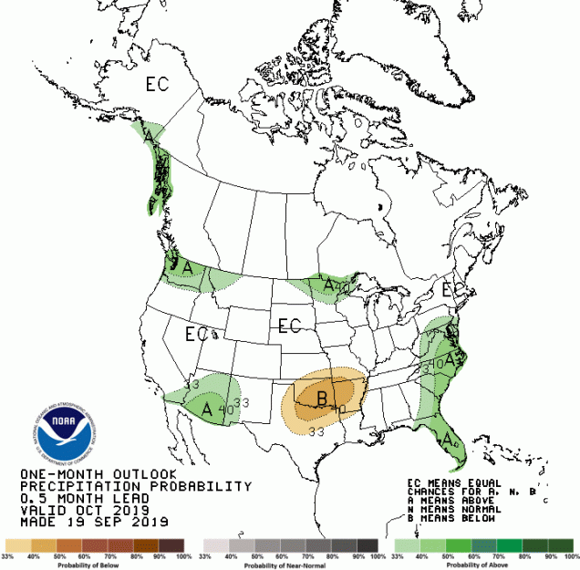 September was a below normal month for precipitation with 2.22 inches of rainfall recorded, which was 1.76 inches below normal. The maximum rainfall in a single day was 1.10 inches recorded on September 2. There were 7 days of rain >.01 in, 5 >.10 in and 1 > 1 in.
