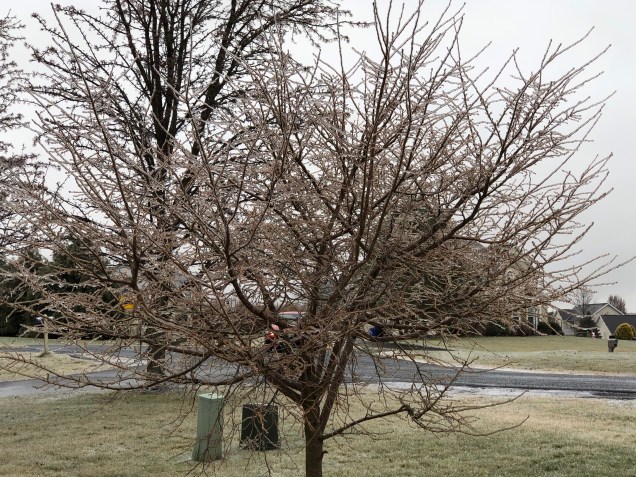 On Tuesday, December 17, our area experienced an ice storm. Freezing rain, supercooled rain droplets, froze on contact on many surfaces during the night.