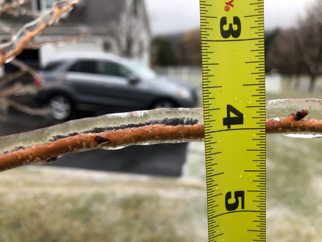 On Tuesday, December 17, our area experienced an ice storm. Freezing rain, supercooled rain droplets, froze on contact on many surfaces during the night.
