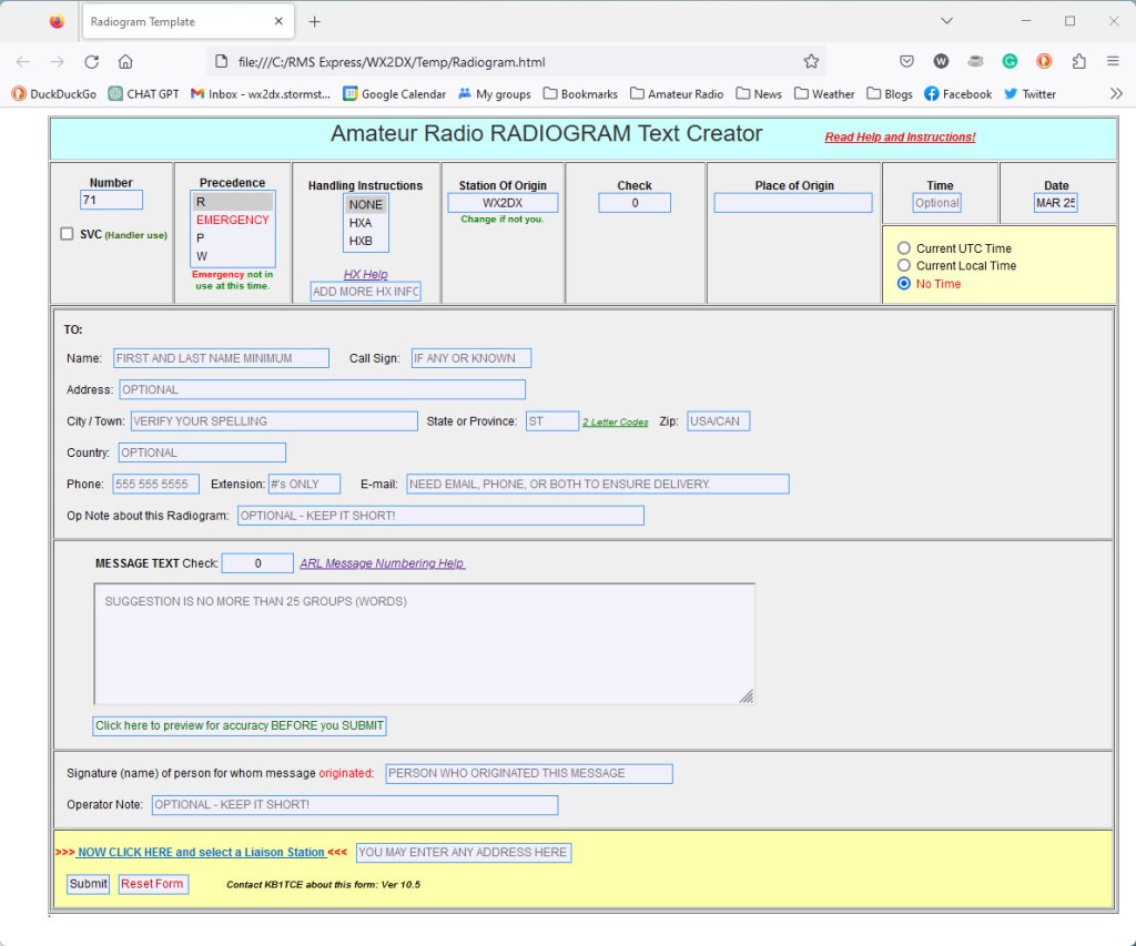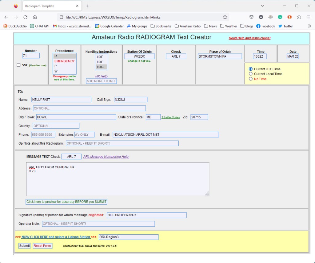 In either case, the Radiogram template is brought up in your default web browser. The message number, call sign, date, and other defaults are already filled. The information for the addressee, message, signature, and liaison station is now entered.
