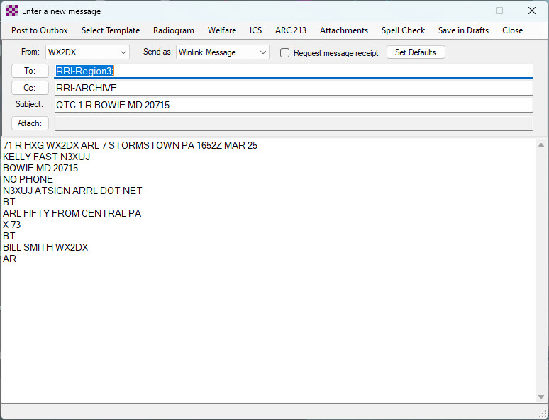 After the “Submit” button is clicked, the “Enter a new message” WinLink window now has the “To”, “Cc”, “Subject”, and formatted NTS radiogram message boxes filled.