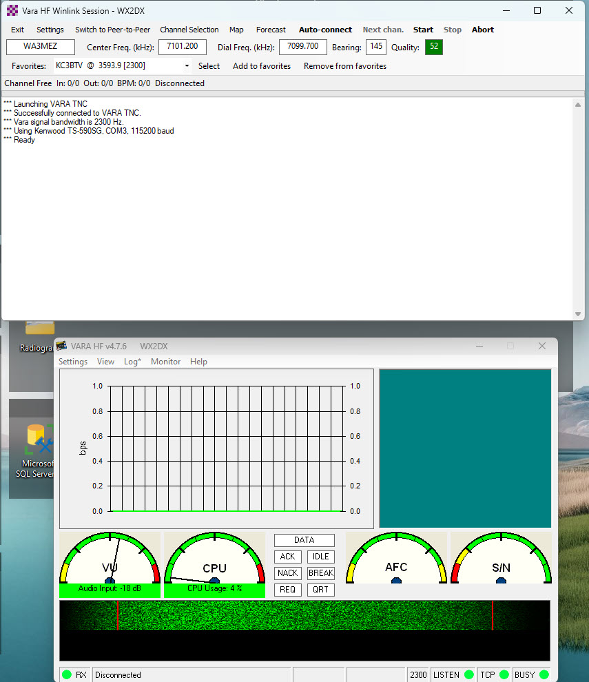 The “Vara HF Winlink Session”, and “Vara HF” modem windows are opened. Therese is the interface for the HF radio that is connected to the PC via a USB cable.
