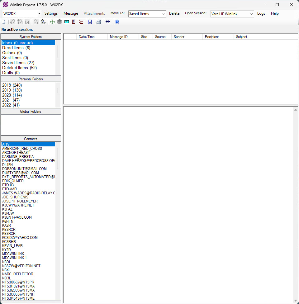 When the radiogram is satisfactorily formatted, click on the “Post to Outbox” tab. The radiogram is now in the “Outbox” system folder in the main WinLink window. To send the message, verify that “Vara HF Winlink” is selected from the “Open Session” dropdown menu. Then click on the “Open Session” tab.