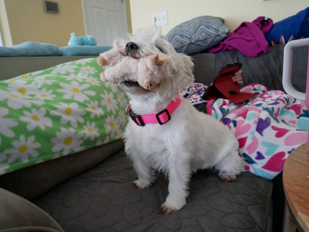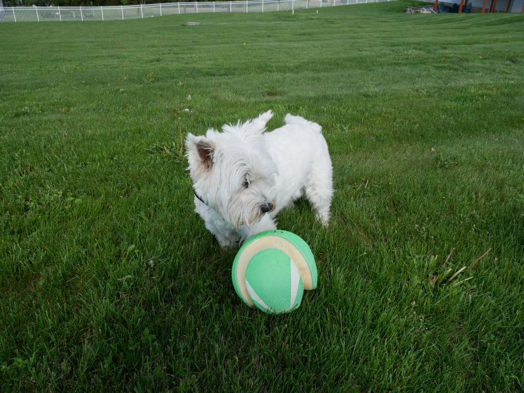 This is Trixie, our female 8-year-old West Highland Terrier. She likes to play tug-of-war and soccer with me. She has the best wigglebutt around and is quite happy most of the time. Right now, she is dealing with being the middle child. Her Gotcha Day was March 3, 2017.