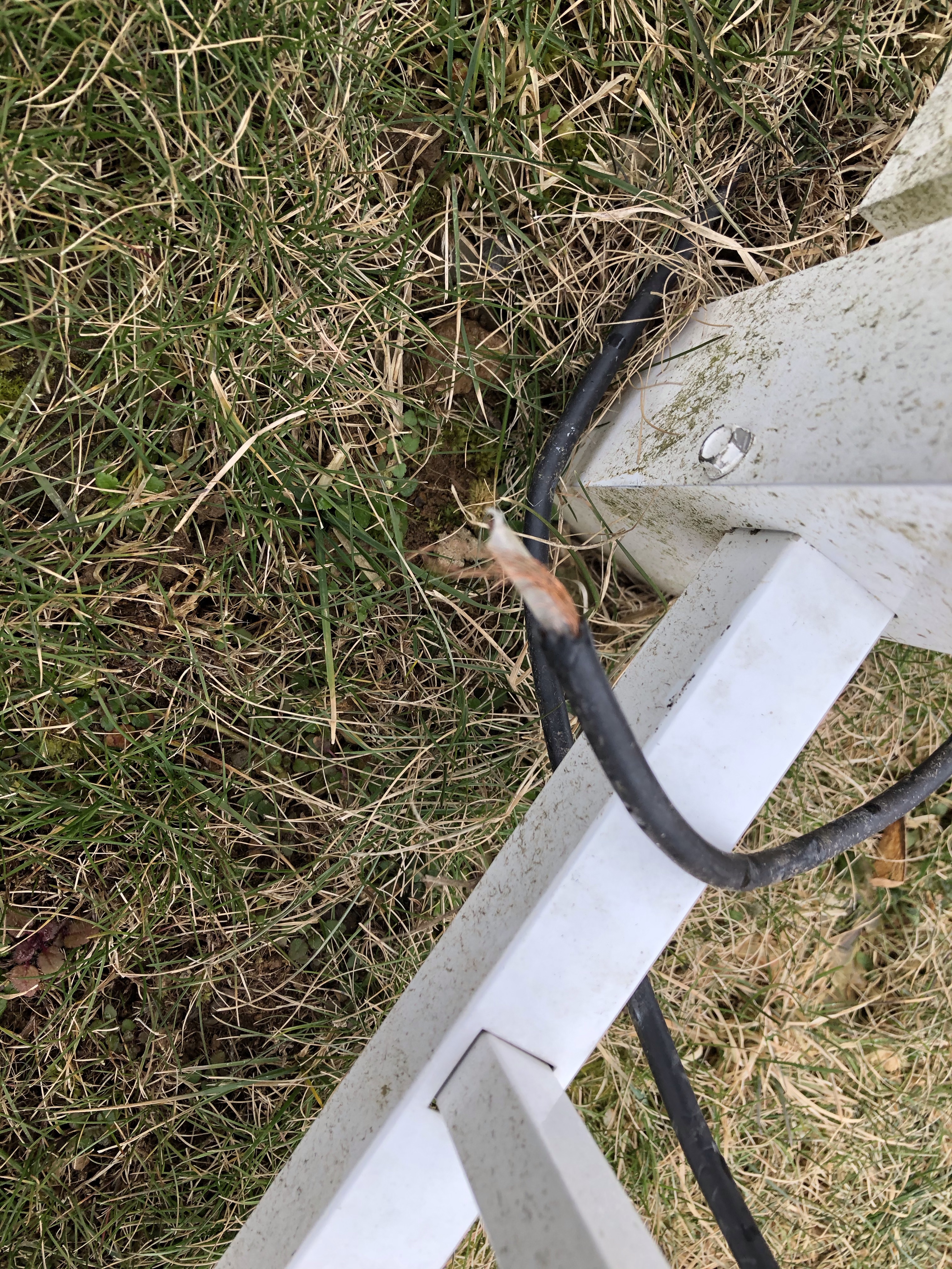 Apparently, an animal had chewed through my VHF/UHF feed line. My dogs didn’t do it because it was outside of the fence.