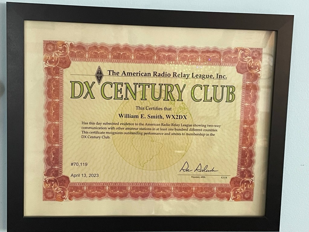 Today, I became a member of The DX Century Club (DX is shorthand for distance). I have confirmed contacts with amateur radio stations in 100 distinct geographic and political entities in the official DXCC List. It took me a little over a year to make all of the needed contacts, gleaned from over 1660 total confirmed contacts.
