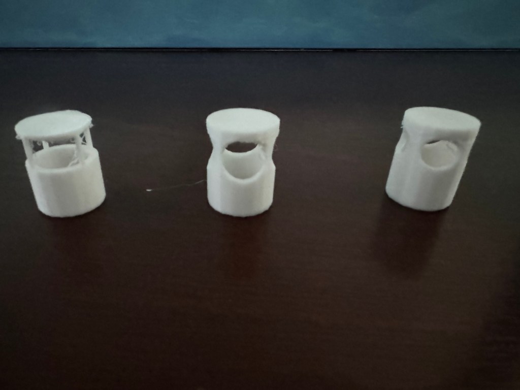 I started with a simple design (the prototype on the left). The posts were too small which caused the rough filament dispersal at the top of the object. The second prototype was better. However, the circular holes were too large which resulted in a weak structure. Also, the inside diameter was too tight to attach to the probe. The final design on the right has smaller circular holes, giving the cover strength. I widened the diameter of the inside diameter 2 mm from the bottom to the top. That resulted in a snug fit.