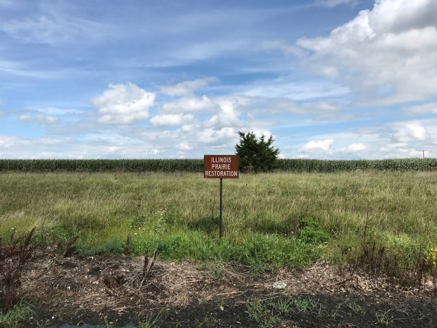 Left the campground near Joliet, IL, before lunch. Went to a nearby Pet Smart for supplies. Got lunch from a Steak and Shake. Then we proceeded west on I-80. Stopped at a rest area and observed a plot of restored prairie.