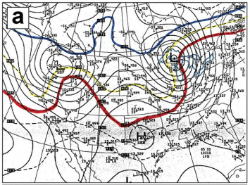 850 mb Analysis for November 10, 1975 1200 UTC. -5 C, 0 C, 5 C isotherms marked by the blue, yellow and red lines, respectively.