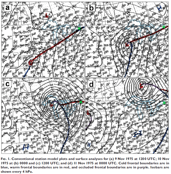 I found the following weather maps from an article in The May 2006 issue of The Bulletin of The American Meteorological Society (BAMS): Reexamination of the 9–10 November 1975 “Edmund Fitzgerald” Storm Using Today’s Technology.