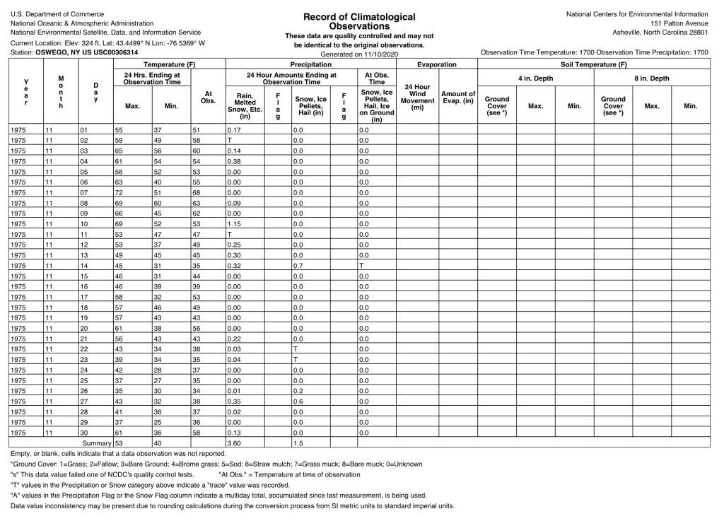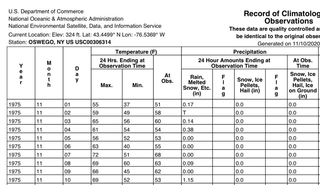 I also obtained the weather records from November 1975 for Oswego, NY from The National Centers for Environmental Information.