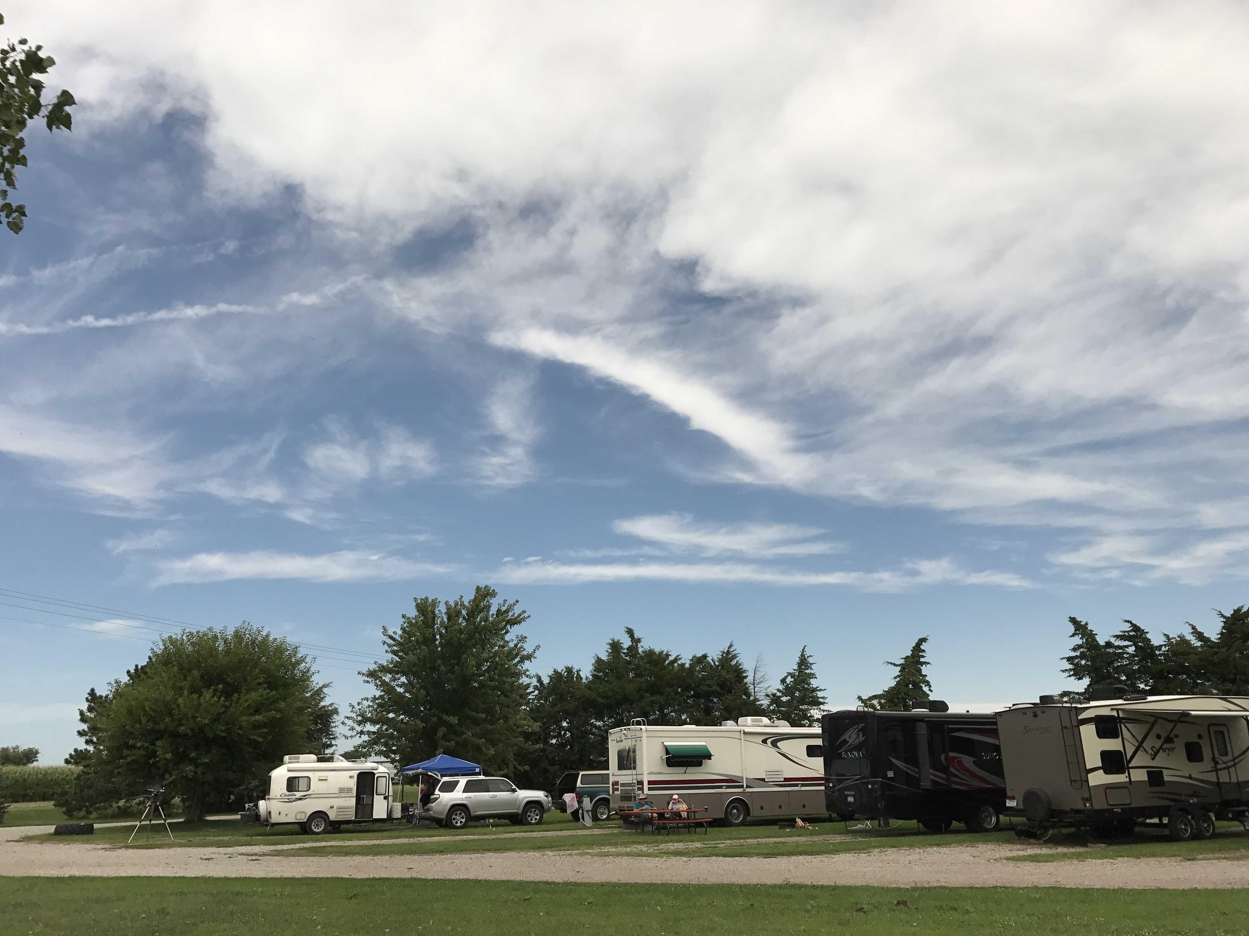 We walked our dogs and had lunch about an hour before totality. I went out and took photos of everyone making preparations. At 20 minutes before totality it was looking weird. It was daylight but the lighting was curiously subdued. It was mostly cloudy, and I was preparing for disappointment, and was resigned that it would be a bust. However, Marla and I went over to sit on a picnic table, not far from our RV, to watch the sun through our eclipse glasses. At this point the sun was a crescent, and faded in and out with the passing of the cirrostratus clouds.