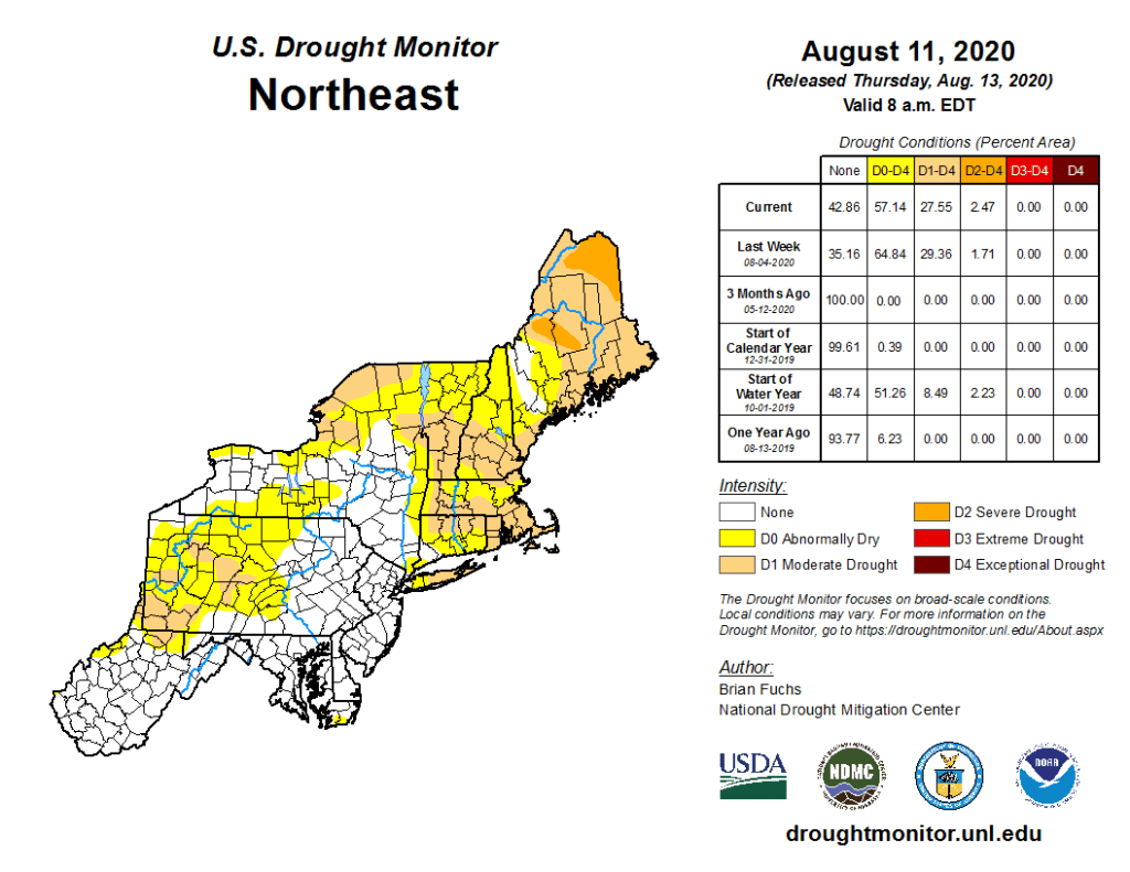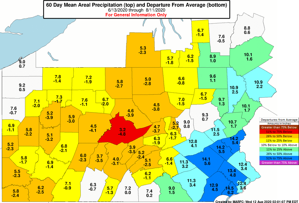 For the 60-day period (6/13/2020 through 8/11/2020) Centre County’s areal precipitation was 3.2 inches which was 4.8 inches below normal for the period. A normal amount would have been 8 inches. This works out to be 60% below normal which is above the 50% threshold for the red portion of the scale. By comparison, here are the values for the surrounding counties: Blair 47%, Cambria 29%, Clearfield 47%, Clinton 41%, Huntington 43%, Mifflin 47%, Snyder 44%.