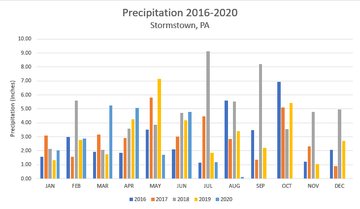 The above graph shows all of the precipitation data I have collected since establishing my weather station in December 2015 until now. This past July was as dry as July 2016. However, August 2020 is on track to be the driest in 5 years.